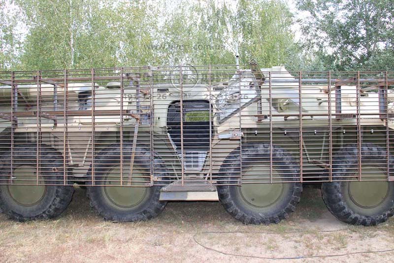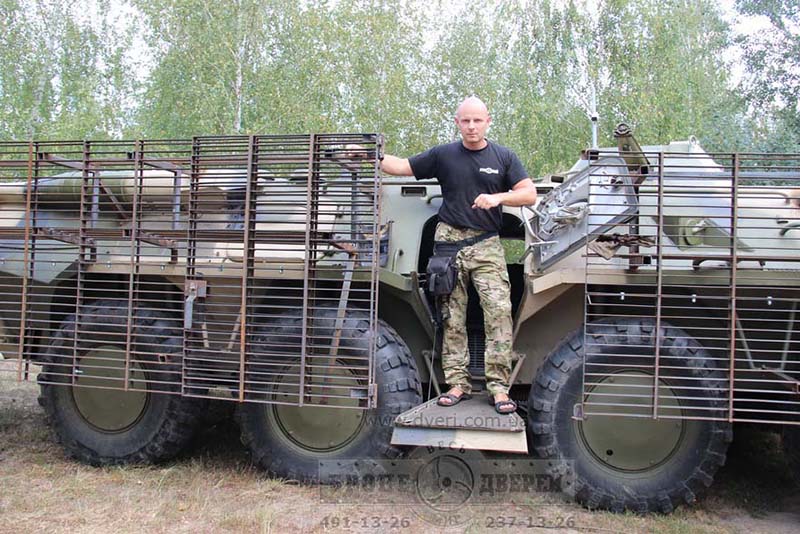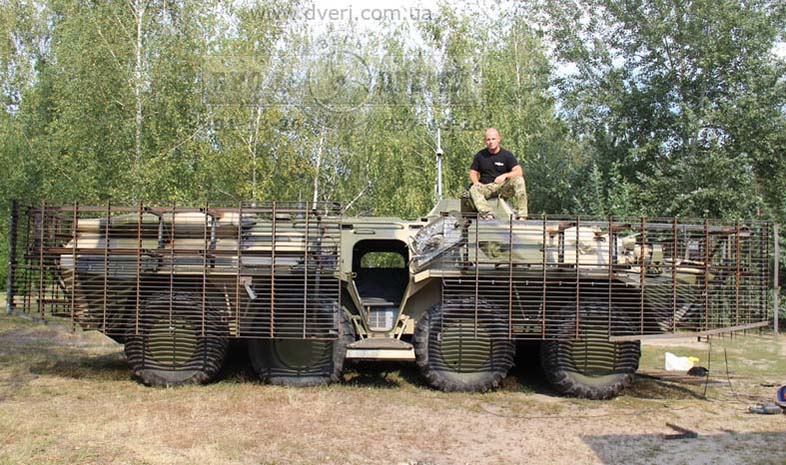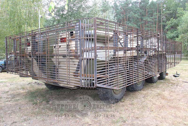 Недавно мы бесплатно, в качестве нашей помощи военным и по их просьбе смонтировали противокумулятивный экран собственной разработки на БТР-80. Как выглядит готовая защитная решётка от компании "Весь мир бронедверей", безвозмездно переданная военным и смонтированная на БТР, вы можете видеть, например, на этих фото противокумулятивного экрана: