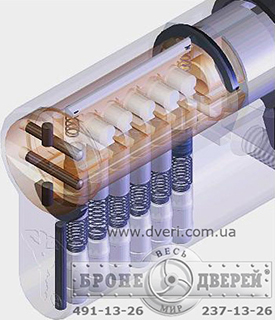 Защита цилиндра от высверливания, воздействия кислотами, вскрытия отмычками, сворачивания.