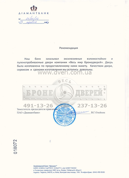 Наше предприятие разрабатывало и изготавливало ряд сложных защитных дверей на заказ банка "Діамантбанк". Всех подробностей работы мы не будем раскрывать, но скажем, что мы изготавливали: пуленепробиваемые двери, двери противопожарные, сертифицированные двери банковских хранилищ, взломостойкие двери, двери входные металлические и т. д.