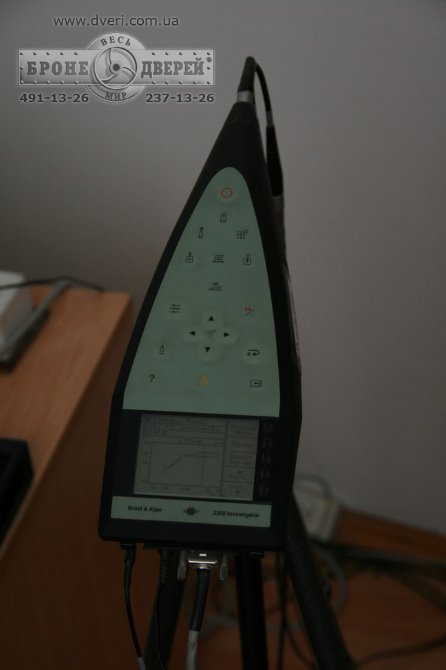 Испытания на звукоизоляцию двери были не менее интересными. Дверь была установлена в кирпичную стену, с толщиной кладки в 2 кирпича, это примерно 0.5 м. Испытуемая бронедверь толщиной всего 75 мм показала довольно высокую звукоизоляцию в 40 дцб. Для сравнения кирпичная кладка в 2 кирпича, 60 дцб. Данный факт говорит о использовании правильных тепло- и звукоизолирующих материалов для изготовления бронедверей. Для сравнения: человеческая речь – это звуки примерно в 30 дцб. Гул реактивного лайнера – это почти предел того, что может выдержать человеческое ухо и это примерно 100 дцб.