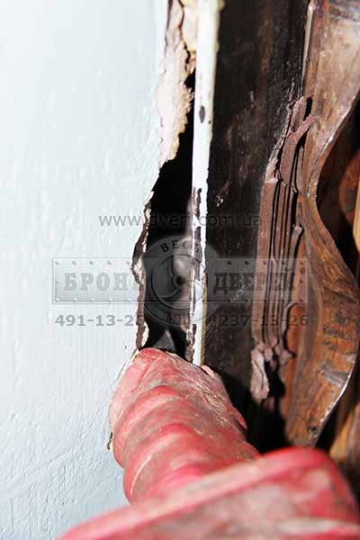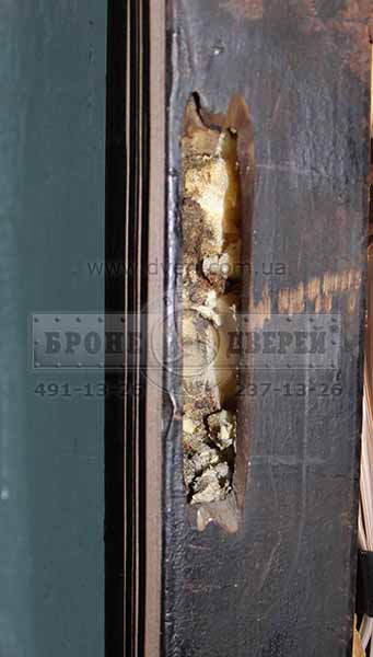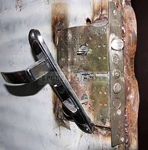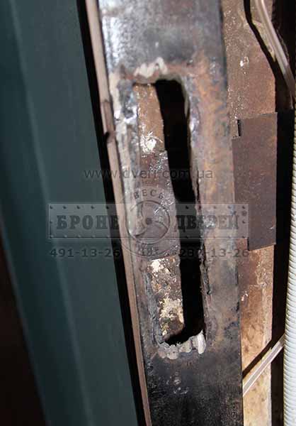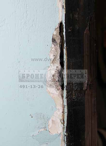 Результат - двери взломали примерно за 5 минут. Не 30 секунд, но и не час. Вы можете уидеть, что не так и много понадобилось сбить бетона. После всех издевательств над дверями, отверстия в коробке для ригелей замков не раздулись, как предполагалось ранее.