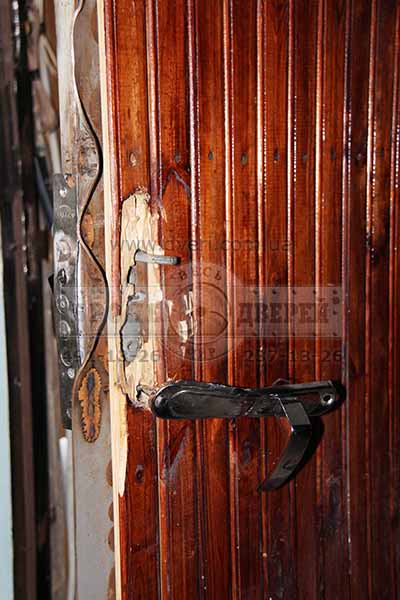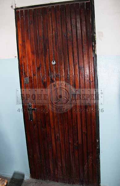 Стальная дверь представляла из себя двухлистовую дверь с коробкой из уголка. Отделки со стороны квартиры не было, а отделка снаружи - вагонка сосновая. Замок верхний Гардиан 1001, внизу замок Класс 012. Оба замка сувальдные: Гардиан - хлипенький, а вот Класс будет помощнее.