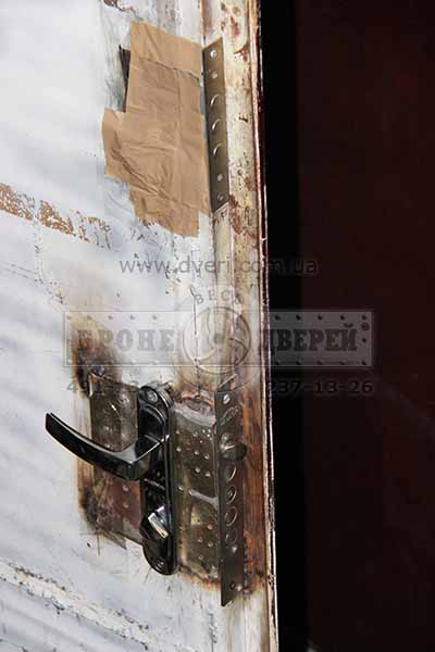 Поскольку этот способ был слишком очевиден, как и его результат, мы решили попробовать двери взломать более сложным способом взлома - отжать полотно ломом. Как мы это делали, видно из фото. Мы закрыли двери снаружи на все замки и начали ломать бронедверь.
