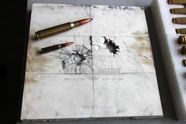 На испытаниях использовались бронебойно-зажигательные пули Б-32 кал 7.62 мм и Б-32 кал 12.7 мм. А так же скандальные пули повышенной пробиваемости ЛПС 1989 года. Ниже вы увидите часть фотографий с испытаний. Результат испытаний, а именно типы брони, толщины и углы обстрела и результат стрельб -остается закрытой информацией.