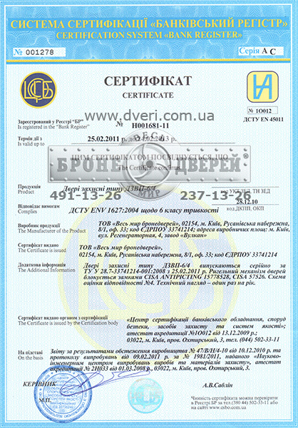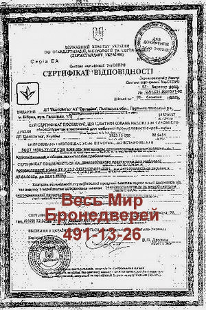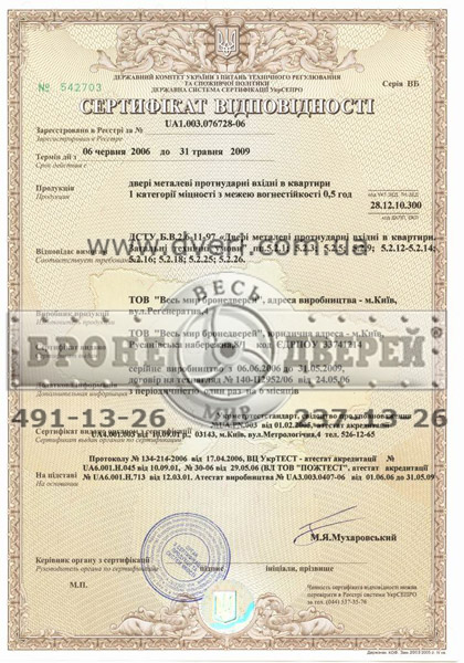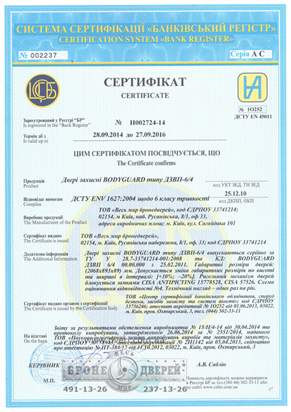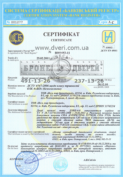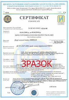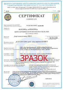 Сертификат на двери защитные взломостойкие класса ДЗВ–6