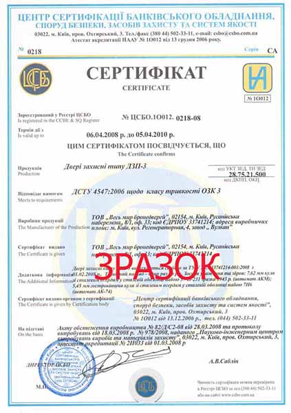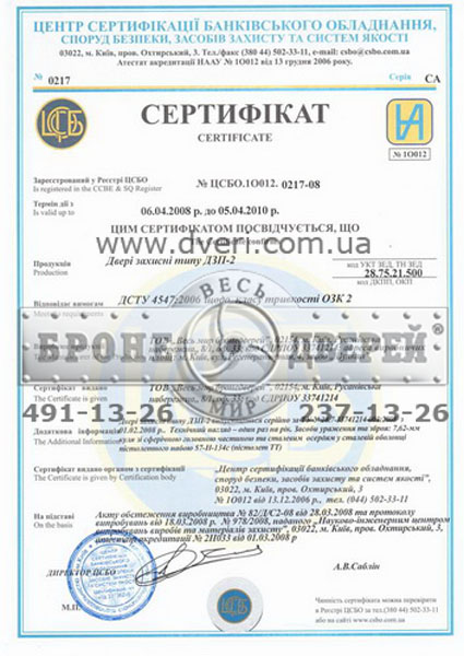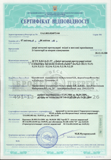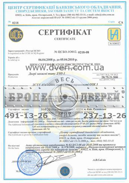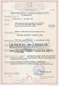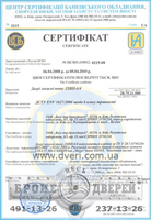 2008 год. Сертификаты на стальные двери "пулестойкие" 2, 3, 4-ые классы по ДСТУ 4546:2006.