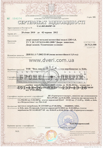 2009 год. Сертификаты соответствия на противопожарные двери и металлические противоударные двери: 30 минут + 1 категория прочности и 2 категории прочности.