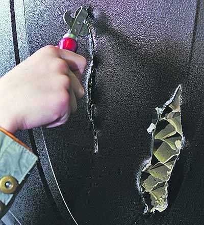 И тем не менее трудно было поверить, что ее вскрыть проще пареной репы. Однако удар обыкновенного перочинного ножа - лезвие входит в сталь, словно в масло, – и дверь проткнута... насквозь!