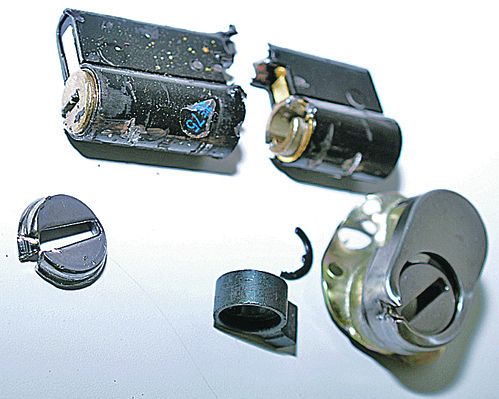 | Сверху личинка замка, которая развалилась пополам, ниже «бронированные накладки», которые должны выдерживать сверло. Все это сделано из сырой стали. |