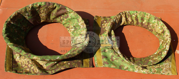 Для нашего бронежилета "Патриот" мы разработали специальный пах, который в базовом бронежилете совместим с плечом. То есть кевларовая вставка в пах и плечо одинаковая - это помогает увеличить универсальность бронежилета. Также, хотя кевларовое наполнение может быть и одинаковым с плечом, сам чехол из кардуры, в который вставляется кевлар, может быть узким или широким - как показано на фото.