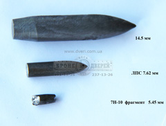 Слева направо: 14,5 мм Б-32, 7,62 ЛПС не калёный, 5,45 мм ПП, 7,62 ЛПС не калёный, 7,62×25 мм ТТ.