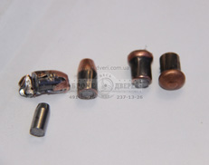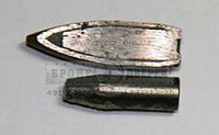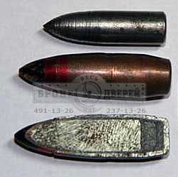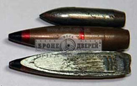 Слева направо: 7,62 ПС старого образца с некалёным сердечником. Далее идут бронебойно-зажигательные патроны 7,62 мм БЗ и 7,62 Б-32 (винтовочный).