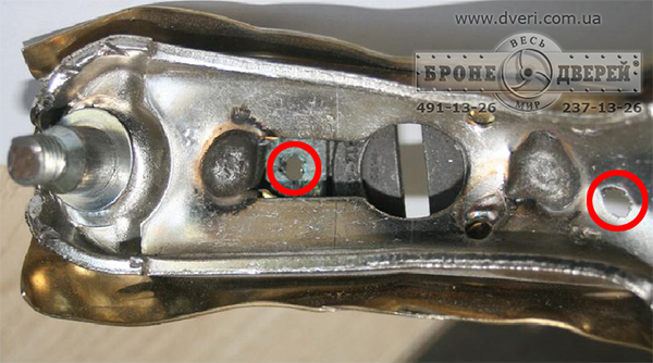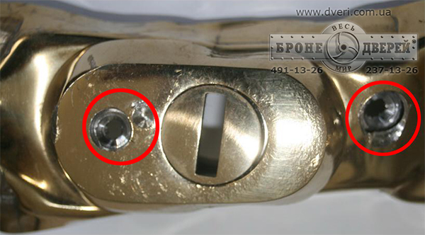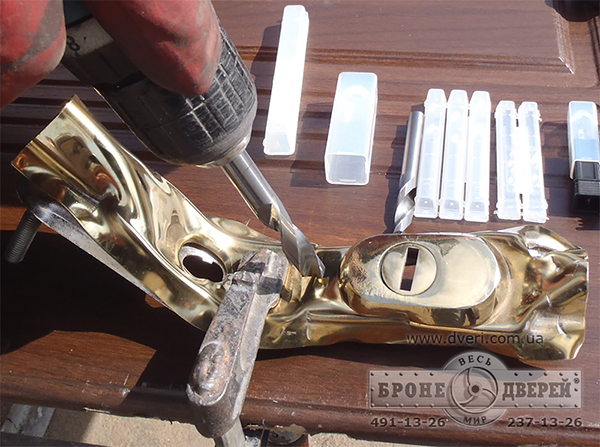 Обратите внимание на толстые болты-стяжки на ручке. Это довольно надёжная защита от срыва. Под декоративной планкой находится мощная стальная основа и в районе цилиндра вварены калёные вставки. Мы решили просверлить ручку спецсверлами, поскольку простыми она не сверлится. Сверлили мы примерно в тех же местах, в которых будут сверлить и воры, пытаясь высверлить хвостовик замка или пины цилиндра.