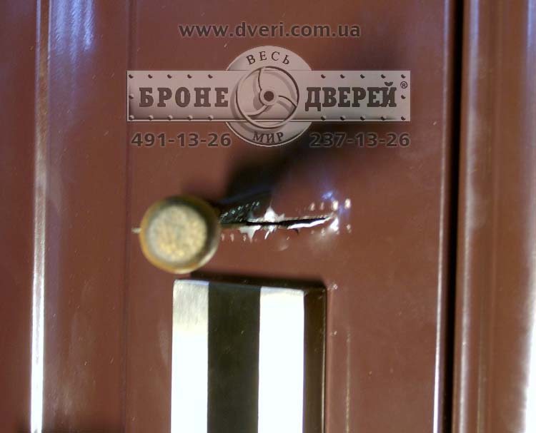 | Злоумышленники пытались вскрыть входные двери путём разрезания стального листа ножницами и хотели вырвать замок ломом, но поскольку замок был вставлен в броневерь через отверстие с торца (так делают практически все производители) – вскрыть стальные двери не удалось! |