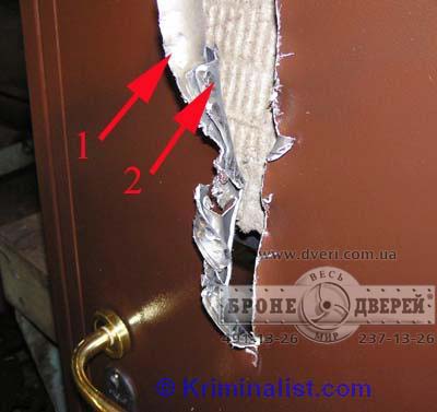 | Вскрытие металлических профильных дверей килечным ножом. Таким методом вскрываются очень многие металлические двери известных фирм: ведь недостаток так называемых профильных дверей – в очень тонком металле. Реально большинство таких стальных дверей сделано из 0,8-1 мм листа металла, несмотря на то что вам говорят. Правило одно: раз дверь профильная – значит тонкая! Очень просто и очень шокирующе. |