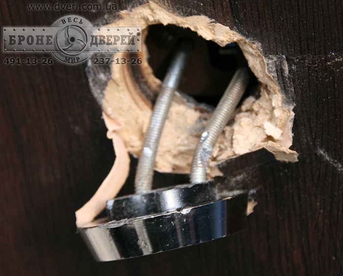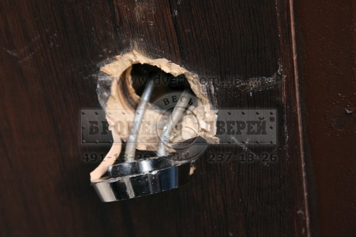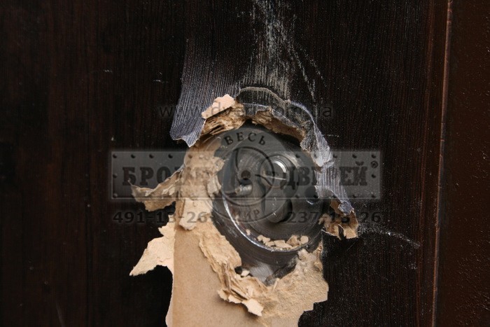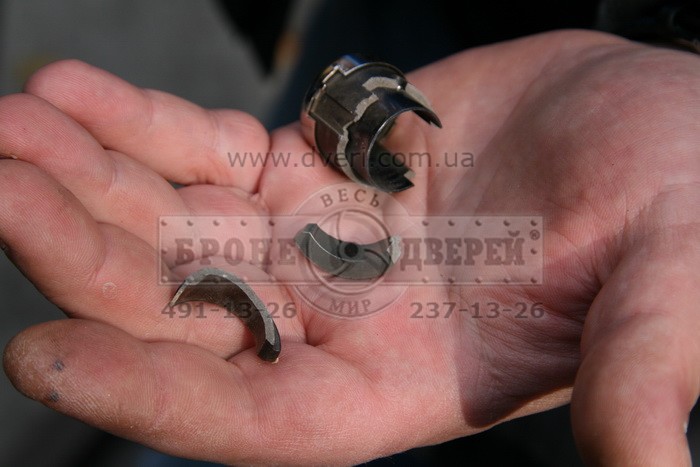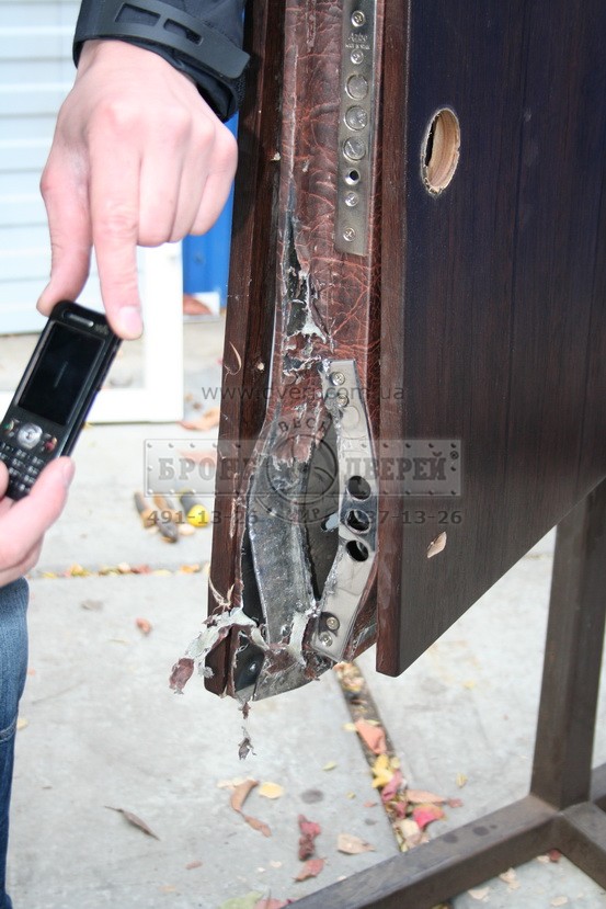 3.45 мин была сорвана броненакладка (броненакладка не была сорвана, она висела на болтах так как слабой частью оказались обратная часть брони, монтирующаяся со стороны квартиры там болты ее просто вырвали – в чем тогда смысл брони, если ответная часть из силумина?????). В момент срыва брони разломилась и сердцевина и выпала 1 часть в квартиру, другая наружу.