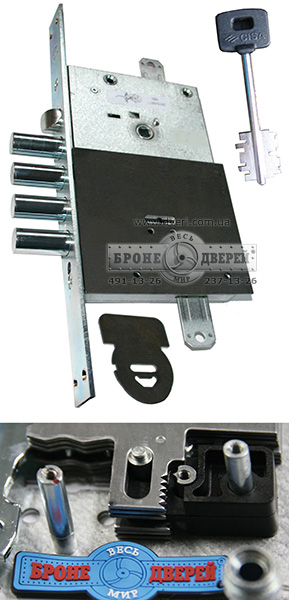 При установке данного замка во входные двери собственного производства, компания «Весь мир бронедверей» усиливает его своими калёными марганцовистыми пластинами, защищающими от высверливания специальными свёрлами вёрхнюю и нижнюю половины корпуса замка; ставится броненакладка с байонетным способом крепления, утапливаемая в полотне стальной двери.
