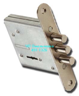 Замок нижний врезной, 3 ригеля по 12 мм., защелка, сувальдный механизм.