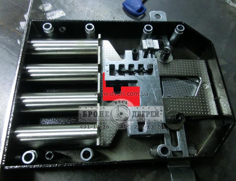 4 ригеля Ø22 мм, а не 18 мм, как у большинства других замков. Особенность ригелей при вылете в 40 мм: ещё 30 мм остаётся в корпусе замка, в то время когда у большинства других замков в корпусе остаётся около 3-5 мм. Это исключает возможность загиба ригелей в случае попытки отжима бронедвери ломом и т. п.;