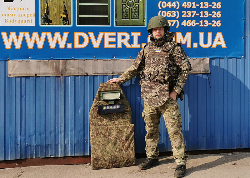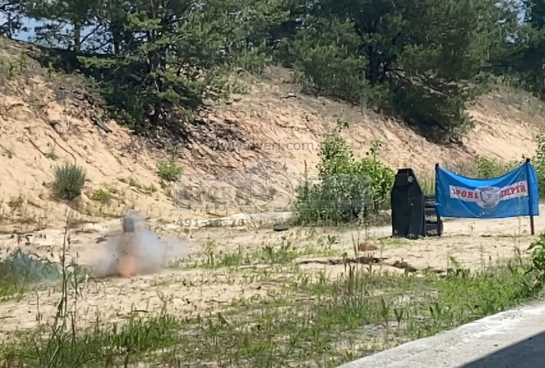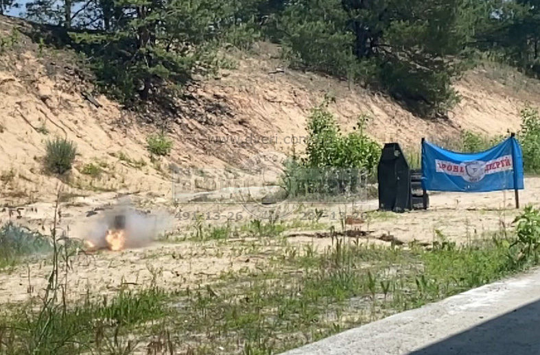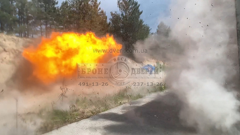 Серед різноманітних випробувань, ми перевіряли бронещит й підривом вистрибуючої міни ОЗМ-72. На відстані приблизно 5 метрів від міни знаходились наші відеокамери, які ми прикрили кевларовими захисними панельками; це були оригінальні кевларові панельки від британського бронежилету Osprey MK-4.
