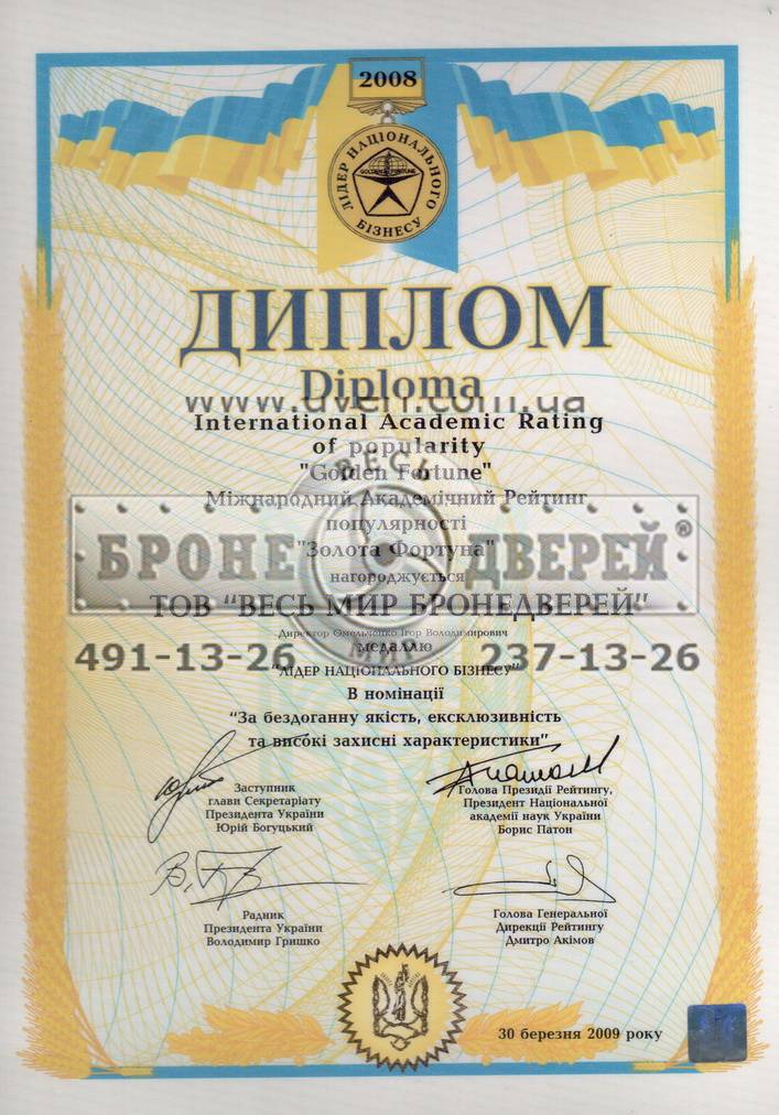 Научно-экспертный совет, рассматривая кандидатуры многих ведущих предприятий Украины за высокое качество продукции и неизменную ориентацию на интересы потребителей, поставил компанию «Весь мир бронедверей» в ряд лучших отечественных производителей. Компания «Весь мир бронедверей» получила медаль «Лидер национального бизнеса» и диплом в номинации: