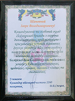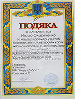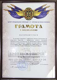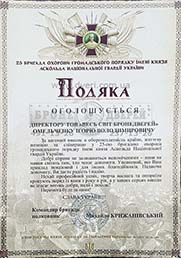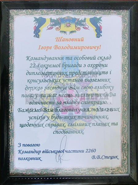 В 2012 году от начальника Управления государственной охраны Украины, генерал-лейтенанта Сергея Леонидовича Кулика, который выразил свою благодарность «За весомый личный вклад и способствование в проведении практических занятий..."