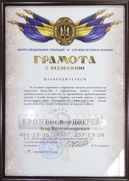 В 2014 году за активную помощь в борьбе с терроризмом Омельченко Игорь и часть коллектива ВМБ получили грамоты от центра "А".