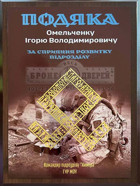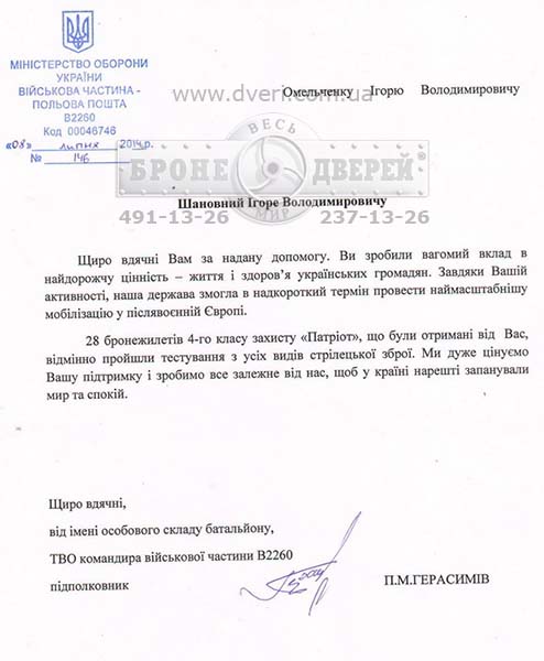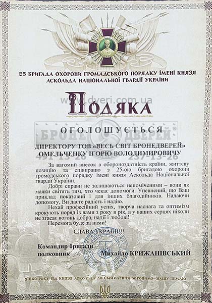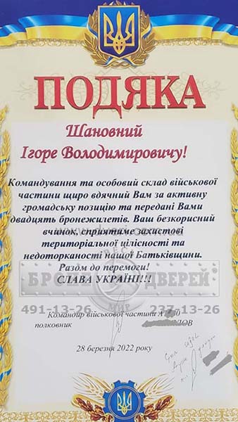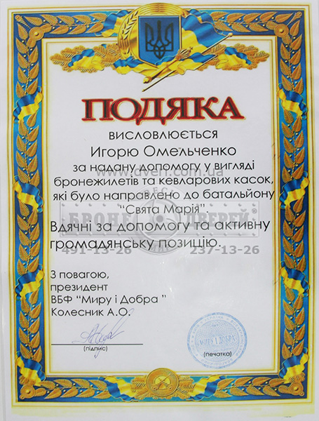 Починаючи з 2014 року, ми надаємо різноманітну допомогу силам захисту Україні. Періодично, отримуємо від них Подяки. Далеко не всі наші проекти завершуються Подякою, але на то вона й благодійна допомога. Ми виробили й подарували величезну кількість бронежилетів, бронеплит, закуповували дрони, посилювали бронеавто й виконали багато інших цікавих проектів.