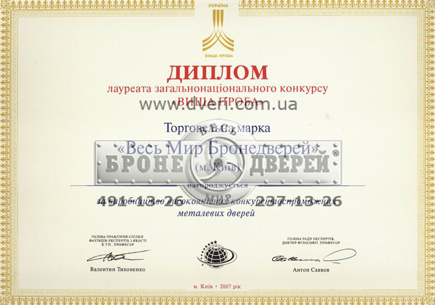 За безупречное качество продукции, неизменную ориентацию на интересы потребителей и весомый вклад в формирование украинского рынка конкурентоспособных товаров и услуг ТМ «Весь мир бронедверей» награждена общенациональным знаком качества «Высшая проба».