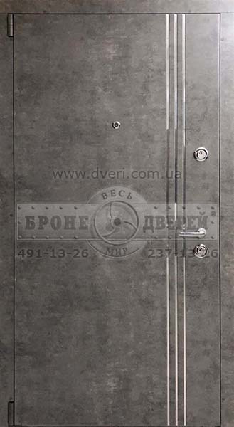 Бронедвері 4+ класу за євростандартом. Оздоблення МДФ панелями кольору бетон з хромованими штросами.