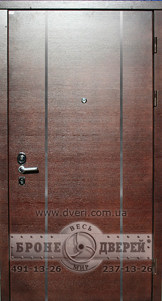 Двери металлические с отделкой МДФ шпонированный натуральным деревом с декоративными полосами из нержавеющей стали. Наличник МДФ шпонированный. Замок нижний CISA 57.986 (двойной - евроцилиндр и сувальдный) с возможностью перекодировки ключа, утопленная броненакладка CISA. Ручка ARMADILLO Libra.