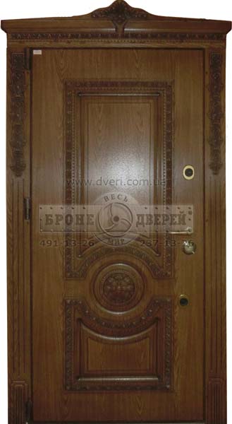 Бронедверь Bodyguard 5/2 с отделкой МДФ панелями с покрытых ПВС пленкой с фрезеровкой, имитирующей резьбу и покрытой темной патиной. Декоративный наличник в виде портала с резьбой. Это надежные двери с элитным дизайном.
