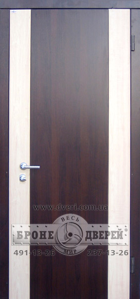 Стальные двери с отделкой ламинированными МДФ панелями, покрытыми пластиком, имитирующим дерево. В данном случае наружный фасад состоит из МДФ панелей двух цветов. Наличник выполнен из ламинированной МДФ панели.