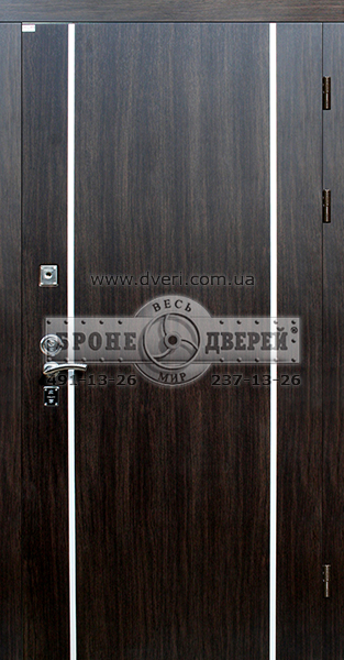 Входная металлическая дверь с отделкой МДФ панелями ламинированными. Эксклюзивный дизайн (покрыты пластиком имитирующим дерево и шпросы серебристый металлик). Наличник из МДФ ламинированного. Замок нижний CISA 57.986 (двойной - евроцилиндр и сувальдный) с возможностью перекодировки ключа, утопленная броненакладка CISA. Ручка Armadillo libra. Замок верхний Gerda Tytan - zx. 3 петли подшипниковые.