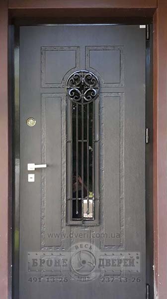 Бронедвери в частный дом. Популярный вариант с защитным стеклопакетом, прикрытым кованной решеткой.