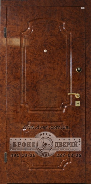Бронедвери(стальные двери) с отделкой МДФ ламинированный пластиком имитирующим дерево, цвет корень ореха, рисунок Кастелли . Наличник из МДФ. Замок нижний CISA 57.685 с возможностью перекодировки ключа. Ручка Armadillo Libra цвет золото. Замок верхний Azbe 8913. c броненакладкой М-4. Петли подшипниковые, глазок Беларус.