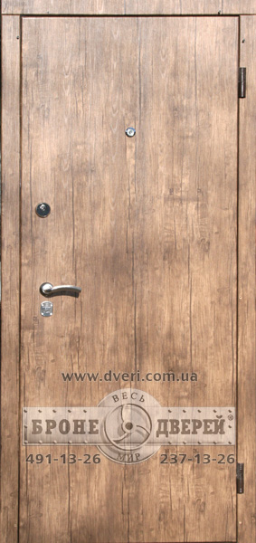 Бронедвері захисні, стійкі до відмичок і зламу, 4+ клас (RC-4) згідно з EN-1627, оздоблення бронедверей - двокомпонентна МДФ панель, ламінована плівкою під дерево коричневого кольору, з прожилками й сучасним дизайнерським фрезеруванням, виділеним іншим кольором.