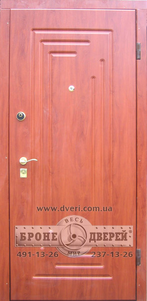 Бронедвері захисні, стійкі до відмичок і зламу, 4+ клас (RC-4) згідно з EN-1627, оздоблення бронедверей - двокомпонентна МДФ панель, ламінована плівкою під дерево коричневого кольору, з прожилками й сучасним дизайнерським фрезеруванням, виділеним іншим кольором.