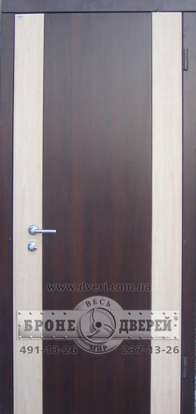 Стальные двери (бронедвери) с отделкой МДФ панелями ламинированными( покрыты пластиком имитирующим дерево). В данном случае наружный фасад состоит из 2-х цветов МДФ. Наличник из МДФ ламинированного. Замок нижний Azbe 8912 c броненакладкой М-5, ручка ARMADILLO Eridan цвет хром.
