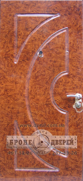 Бронедвері захисні, стійкі до відмичок і зламу, 4+ клас (RC-4) згідно з EN-1627, оздоблення бронедверей - двокомпонентна МДФ панель, ламінована плівкою під дерево коричневого кольору, з прожилками й сучасним дизайнерським фрезеруванням, виділеним іншим кольором.