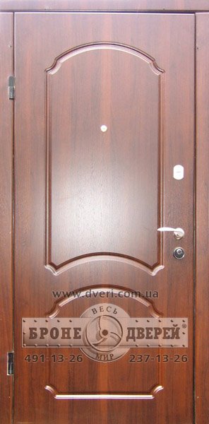Бронедвері захисні, стійкі до відмичок і зламу, 4+ клас (RC-4) згідно з EN-1627, оздоблення бронедверей - двокомпонентна МДФ панель, ламінована плівкою під дерево коричневого кольору, з прожилками й сучасним дизайнерським фрезеруванням, виділеним іншим кольором.