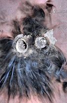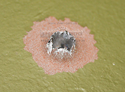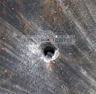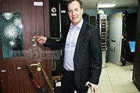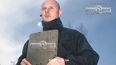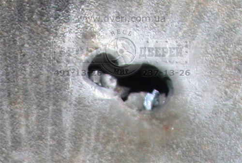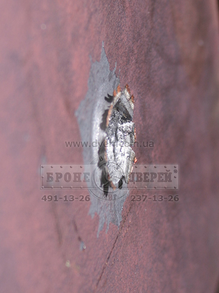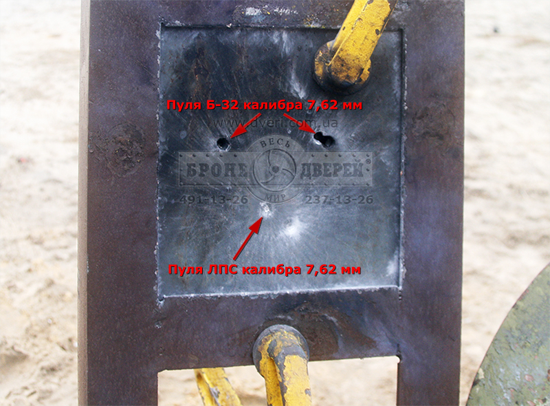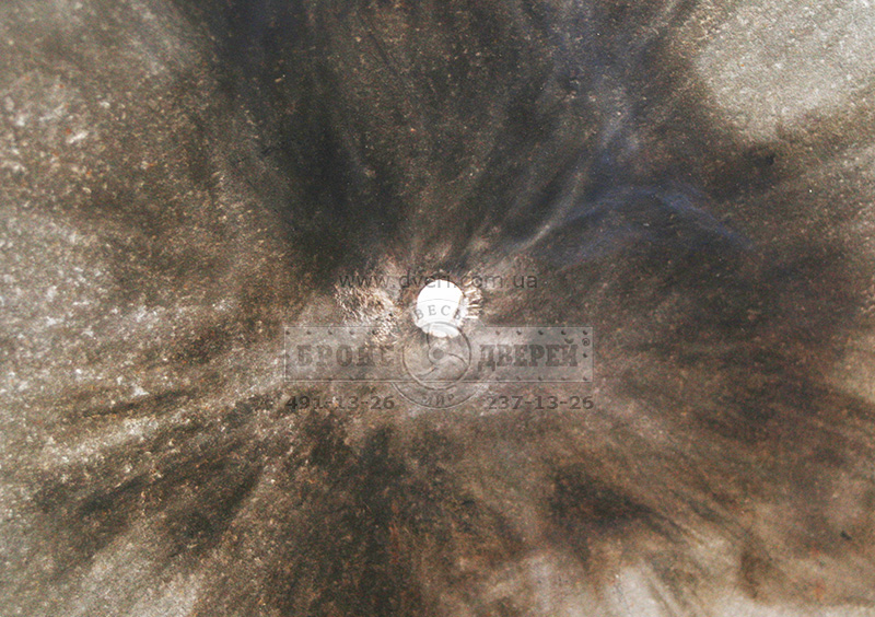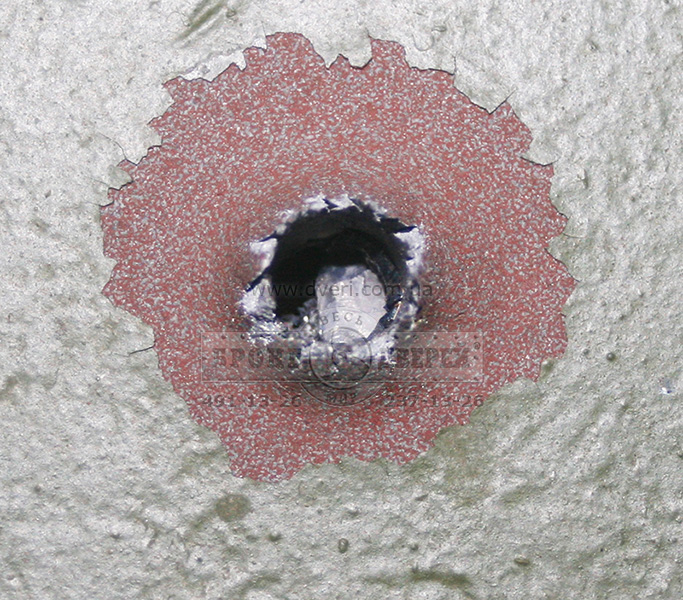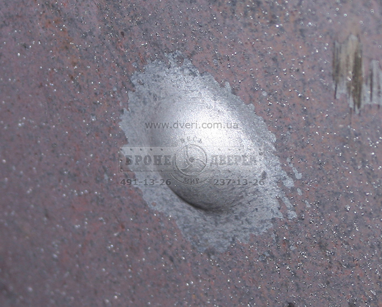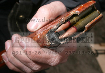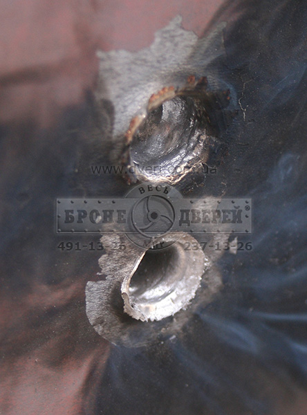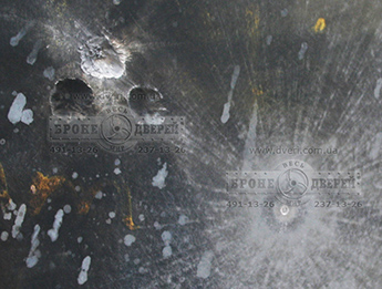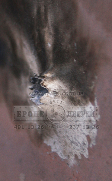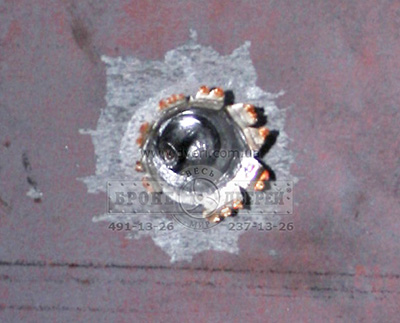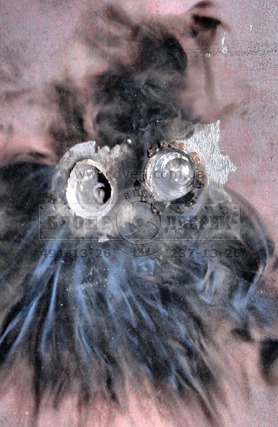 Следующим этапом была замена сверхпрочной импортной брони, применяемой для изготовления входных дверей, с 7-ми на 10-ть мм. Мы попросили снайпера ещё поработать над данным образцом патроном Б-32. Первый выстрел и... пуля не пробила! Затем второй в то же место и третий... И снова пробоя нет! Снайпер смог уложить все 3 пули на площади с металлическую монету.