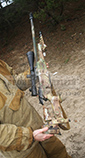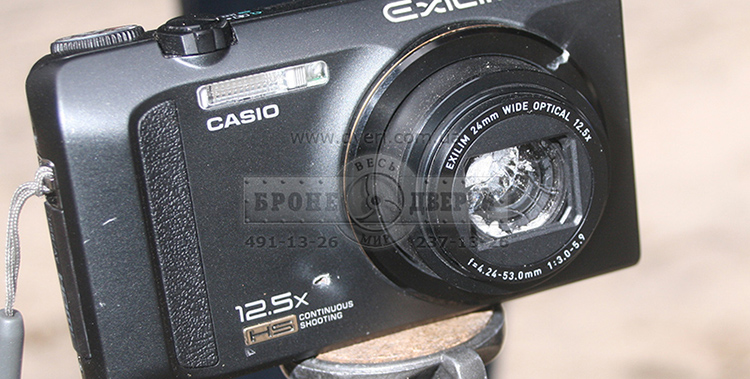 Конечно, на таких испытаниях не обошлось без потерь: после первого же выстрела пулей Б-32 погибла видеокамера. На фото видно, что в неё попали аж 3 осколка от пули, один из которых разбил объектив, а 2 других осколка прошили металлический корпус, повредив его. Данная камера стояла примерно в 1 метре от бронесталь-мишени, в которую попала пуля Б-32. На одном из предыдущих фото со снайпером очень хорошо видно, как на фоне сосен разлетаются многочисленные осколки от пули Б-32.