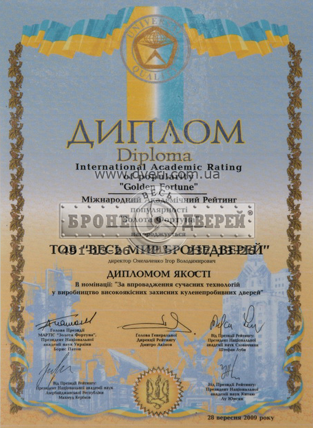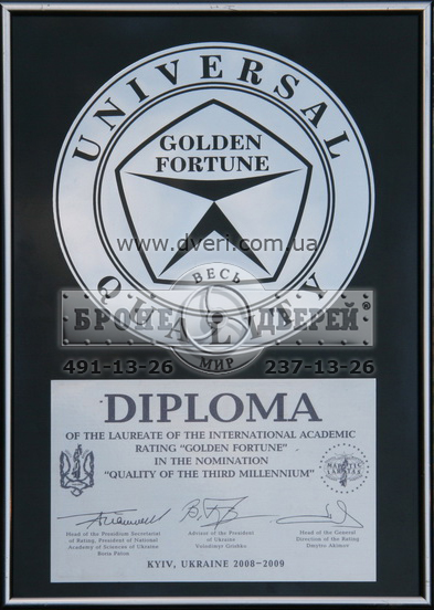 Предприятие «Весь мир бронедверей» за внедрение современных технологий в производстве защитных дверей было отмечено Серебряным дипломом качества «Качество третьего тысячелетия» и дипломом.