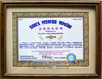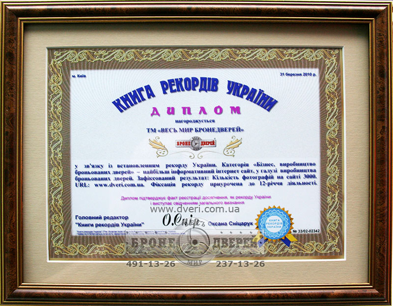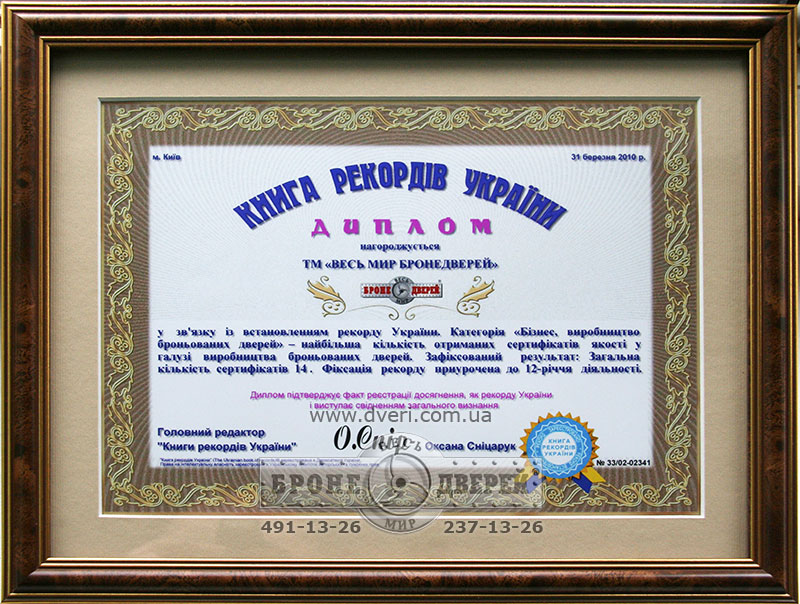 Мы рады сообщить, что 31 апреля 2010 года компания «Весь мир бронедверей» получила дипломы Книги рекордов Украины, подтверждающие установление нашей компанией 2-ух украинских рекордов!