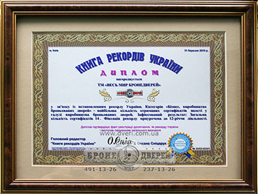 Нам приятно, что Книга рекордов Украины отметила нашу научно-исследовательскую деятельность, направленную на улучшение свойств и создание новых более надежных входных дверей украинского производства.