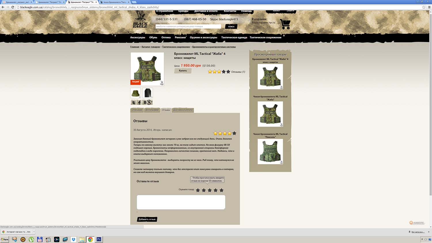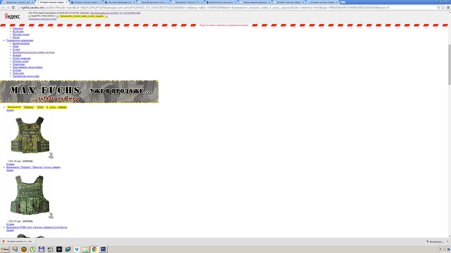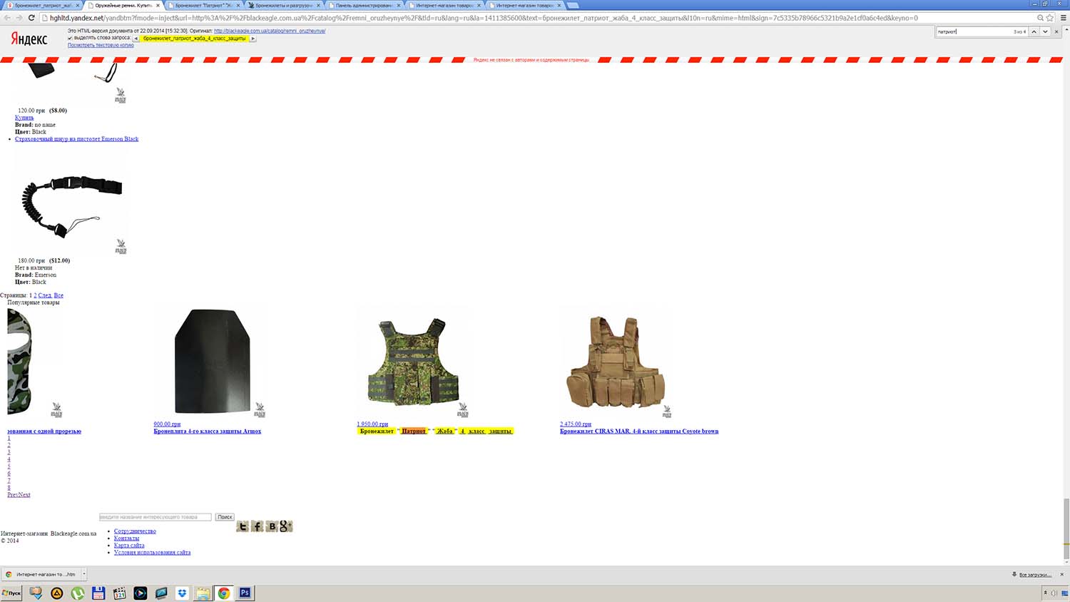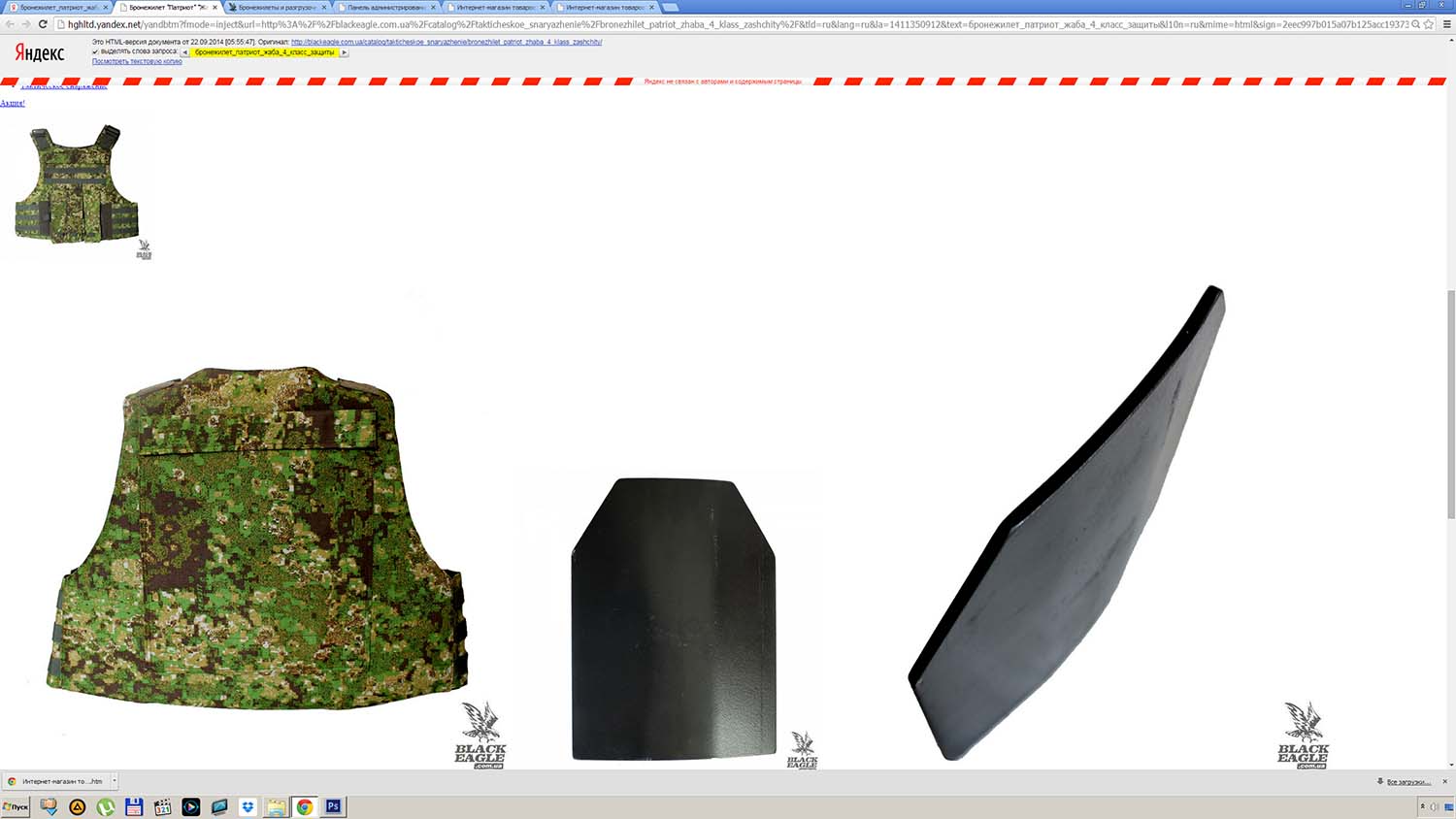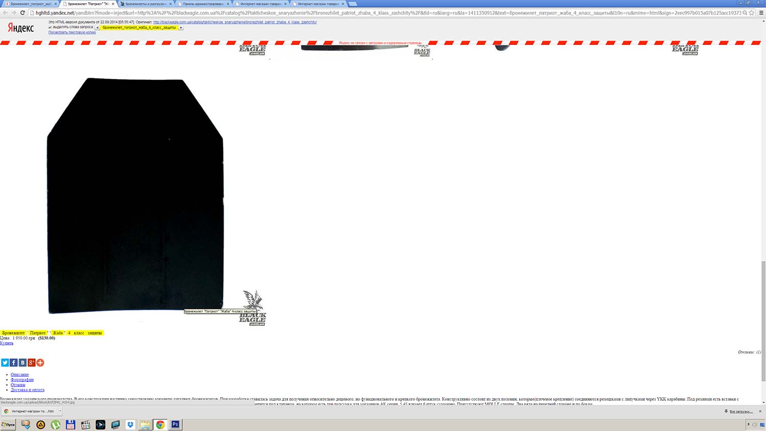 И, хотя, по неведомым техническим причинам, на выяснение которых нету времени, кеш Яндекса не "подтянул" оригинальные стили сайта злоумышленников: цвета, шрифты и прочее, суть вещей он сохранил прекрасно - та же цена в долларовом эквиваленте, те же иллюстрации, но другой адрес страницы и заголовок уже без "ПАТРИОТА". Но стал ли такой "бронежилет" уже "не ПАТРИОТ" от того безопаснее? За смехотворную цену в 2000 гривень. Это ещё предстоит выяснить правоохранительным органам.