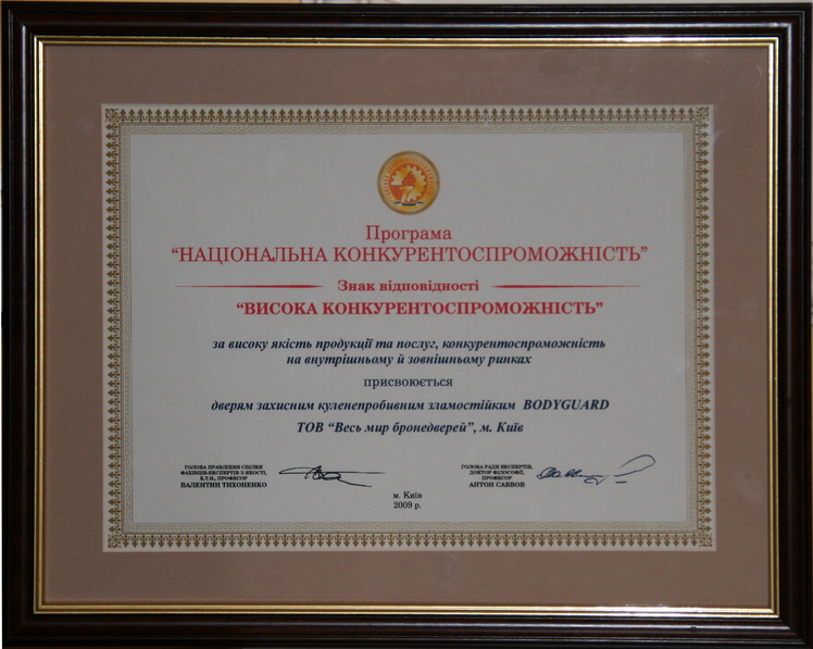 20 августа 2009 года в Киеве, в Государственной резиденции Президента Украины по улице Грушевского 22 состоялось торжественное мероприятие Ассамблеи деловых кругов, на котором предприятие Весь мир бронедверей, получило знак соответствия «Высокая конкурентоспособность». в рамках программы «Национальная конкурентоспособность»,
