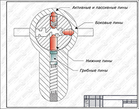 Активные пины аналогично противодействуют попыткам открыть замок не тем ключём: если лунки на поверхности ключа неправильно расположены - сердцевину провернуть не получится.